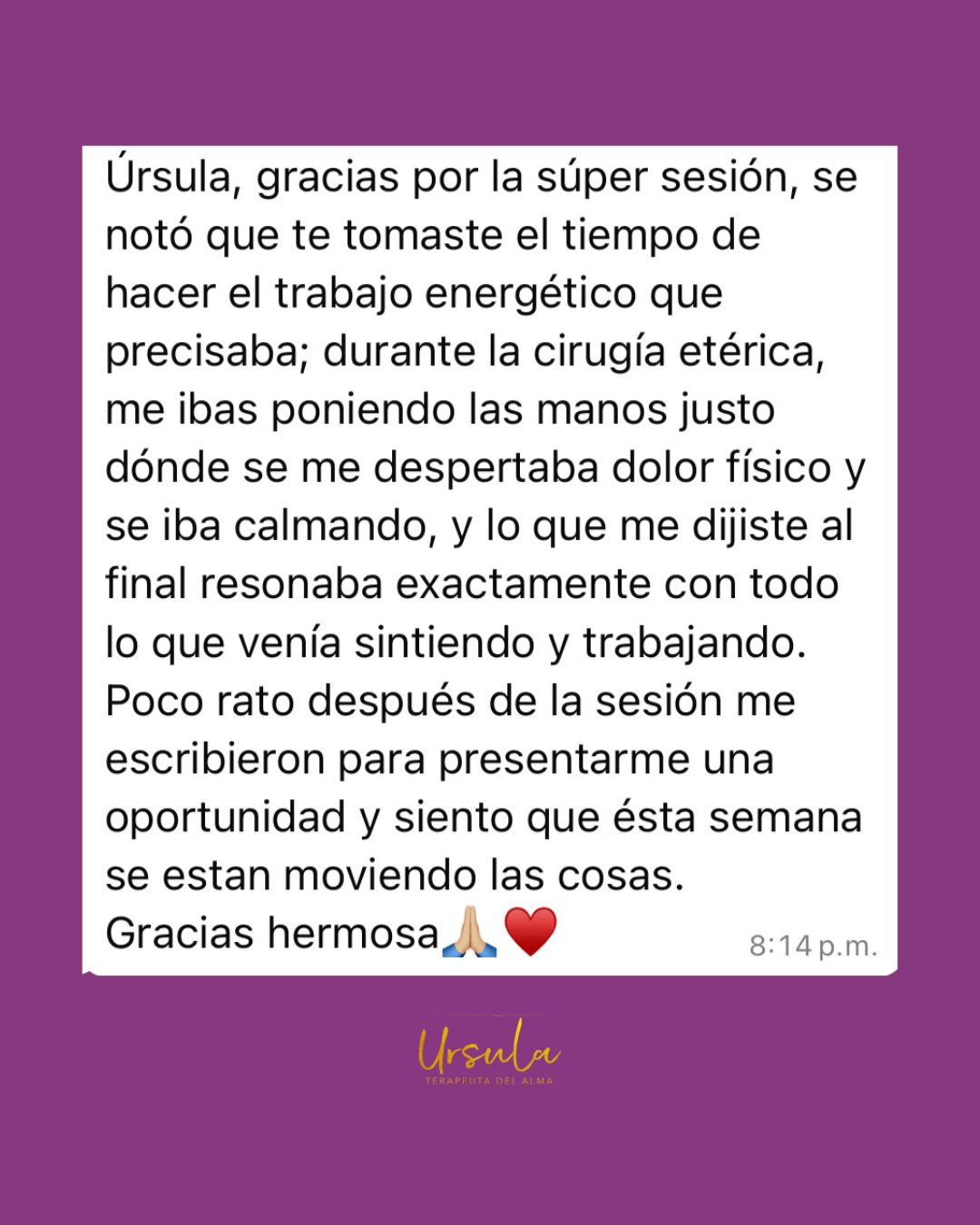 En la sesión individual Ursula se conecta a ti para revisar cuerpo a cuerpo, dimensión a dimensión para liberar, cortar, transmutar, alquimizar, cada atadura en tu Alma, desde la 3ra dimensión (tu cuerpo físico) hasta la 12va dimensión de conciencia, realizando la cirugía etérica que te libera de los velos del dolor, el sufrimiento, la ignoracia y el ego para que puedas acceder al espacio superior de tu Magna Presencia Yo soy donde se activan los dones, los talentos, la verdad, el entendimiento y la esencia divina & auténtica de tu Ser fuera de todos los bloqueos.